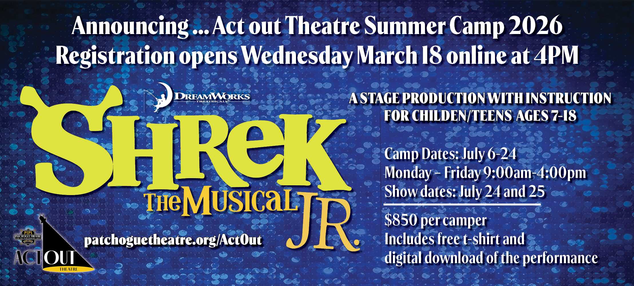 About the show: Beauty is in the eye of the ogre in Shrek The Musical JR., based on the Oscar-winning DreamWorks Animation film and fantastic Broadway musical. It's a "big bright beautiful world" as everyone's favorite ogre, Shrek, leads a cast of fairytale misfits on an adventure to rescue a princess and find true acceptance. Part romance and part twisted fairy tale, Shrek JR. is an irreverently fun show with a powerful message for the whole family.
